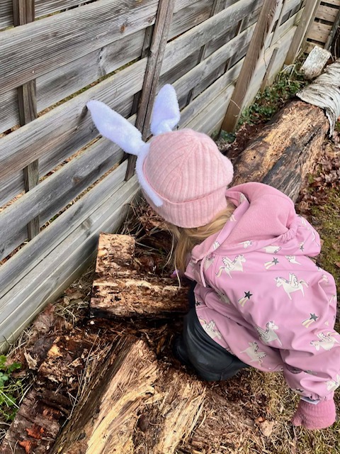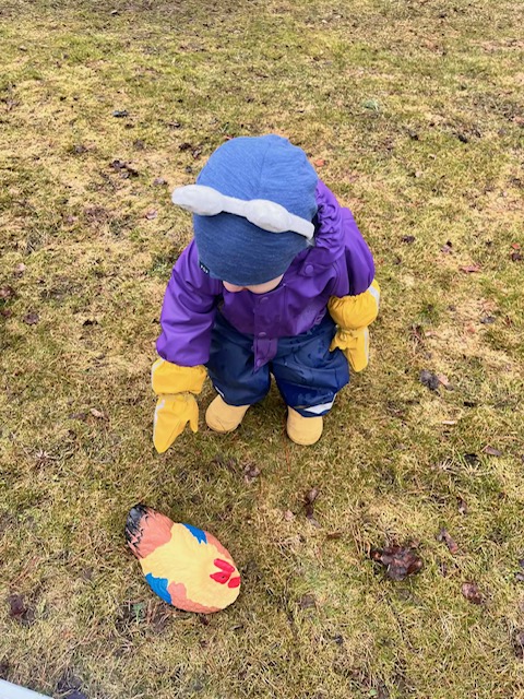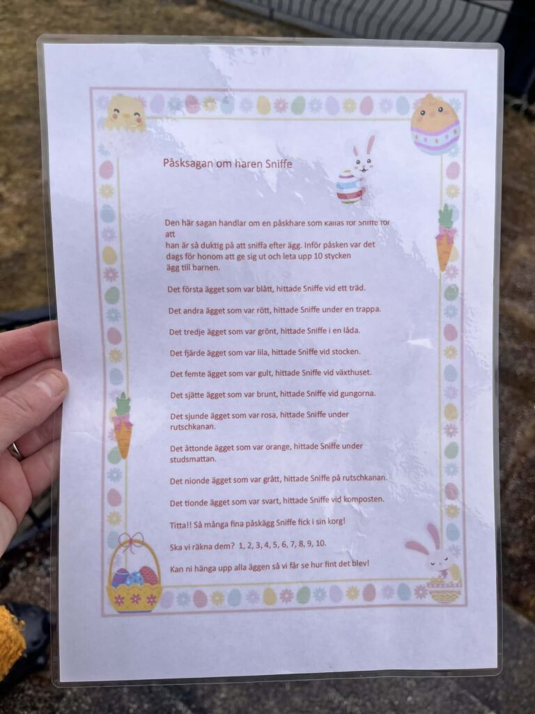 Sen blev det FEST! Först sjöng vi påsksånger tillsammans. Sen berättade Jessica att påskharen hade varit i hennes trädgård dagen innan. När hon tittade ut såg hon att det låg ett brev på trappan. Det var från påskharen. Barnen letade efter gömda ägg och allt avslutades med en belöning i form av mumsiga kakor.