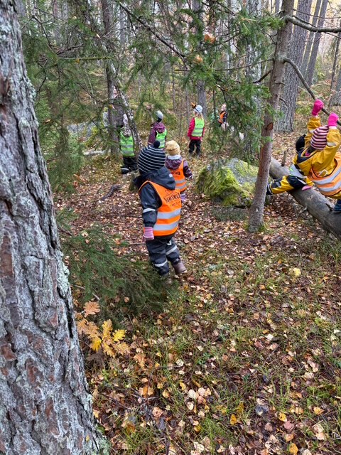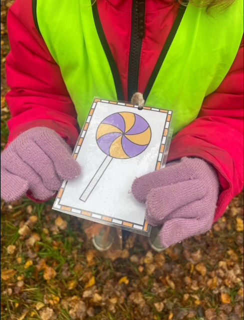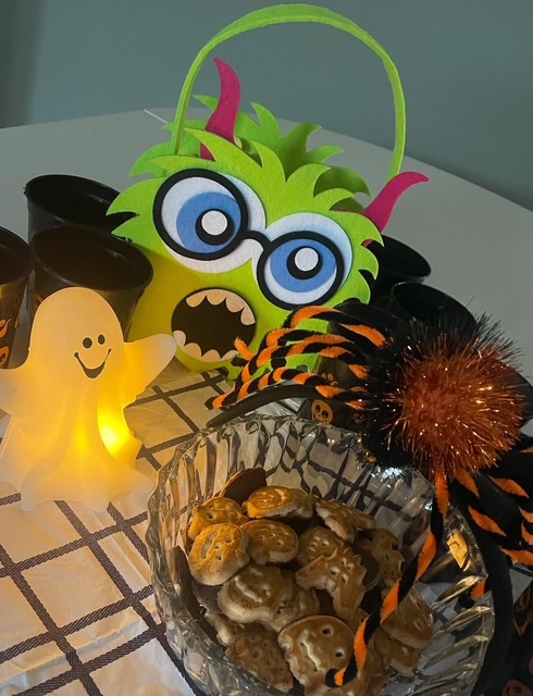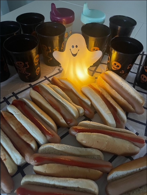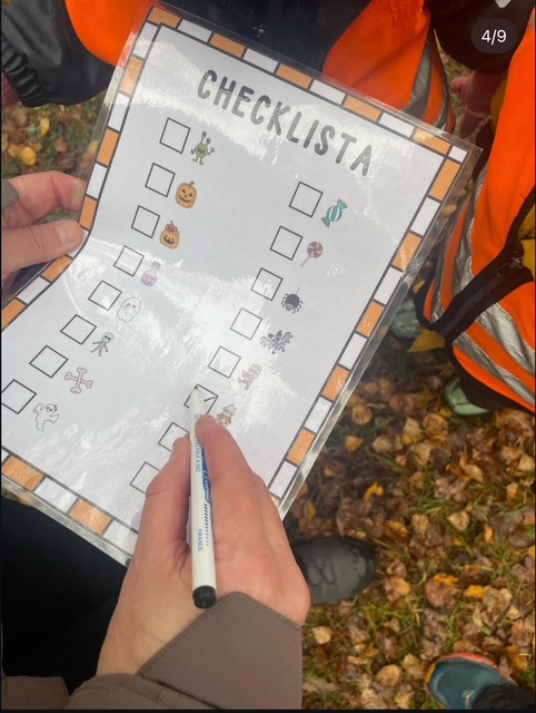 Vi letade efter halloweenbilder i skogen, lekte, lyssnade på sagan om spökena som ändrade färg, sjöng sånger om spöken. Allt avslutades med korv med ”blod” och snacks som såg ut som fladdermöss.